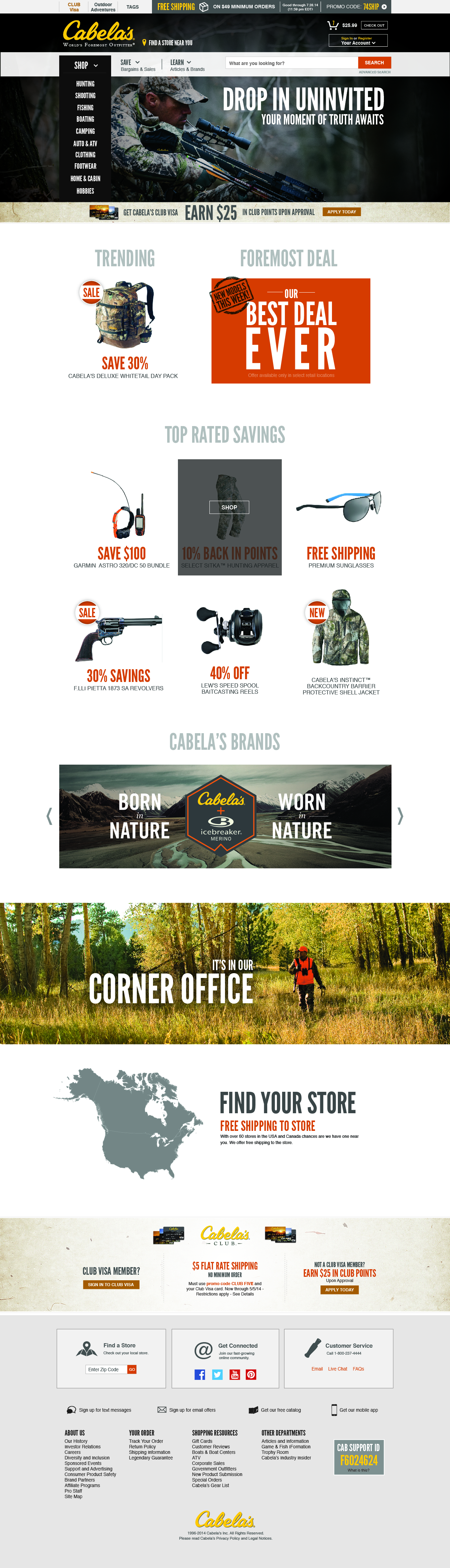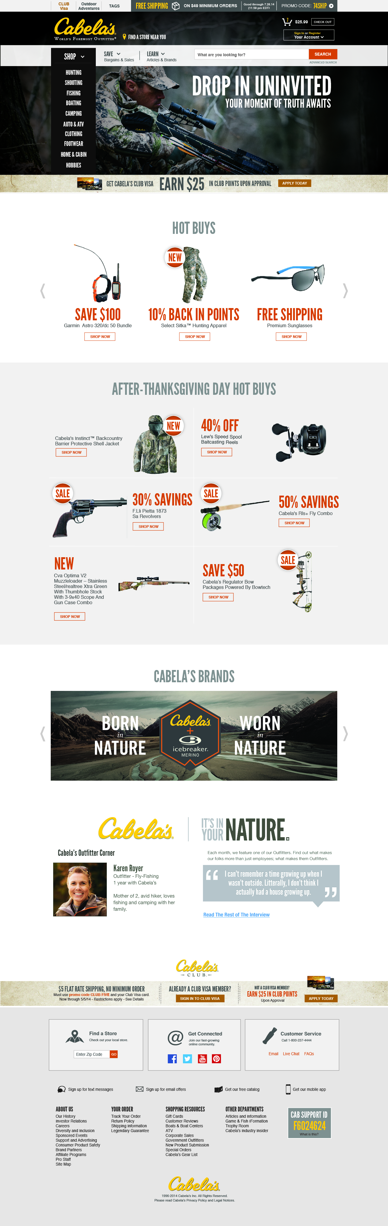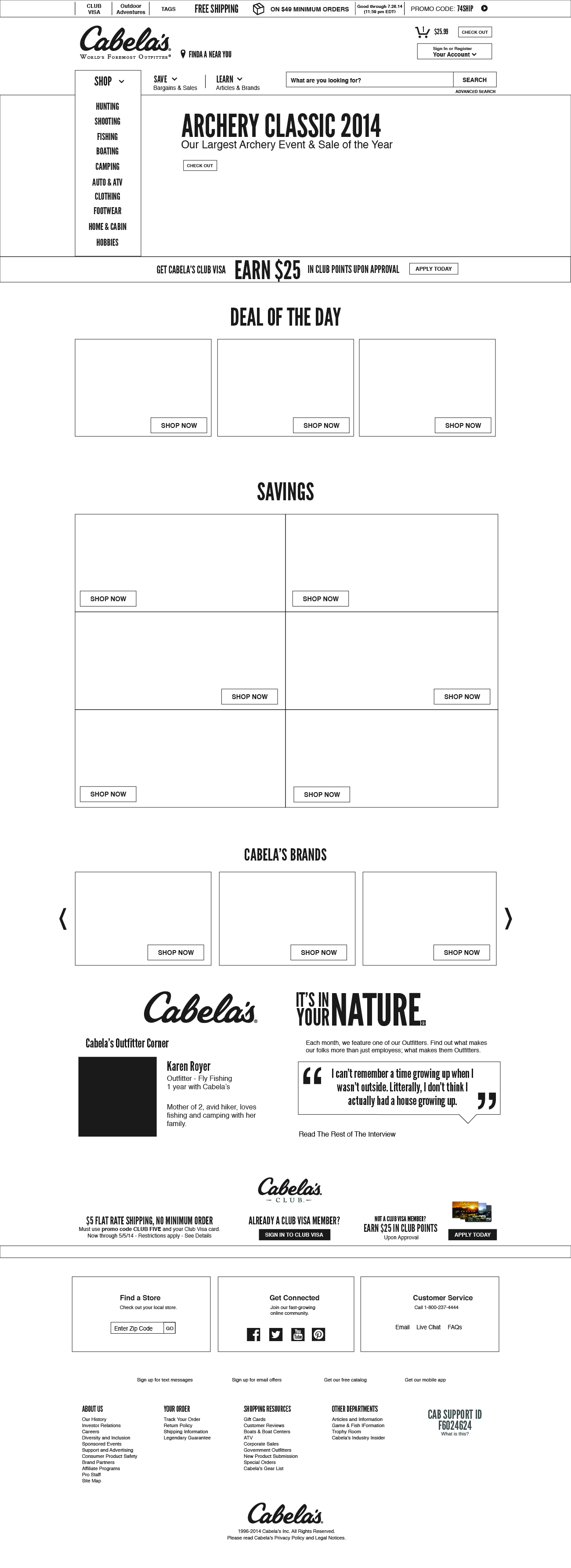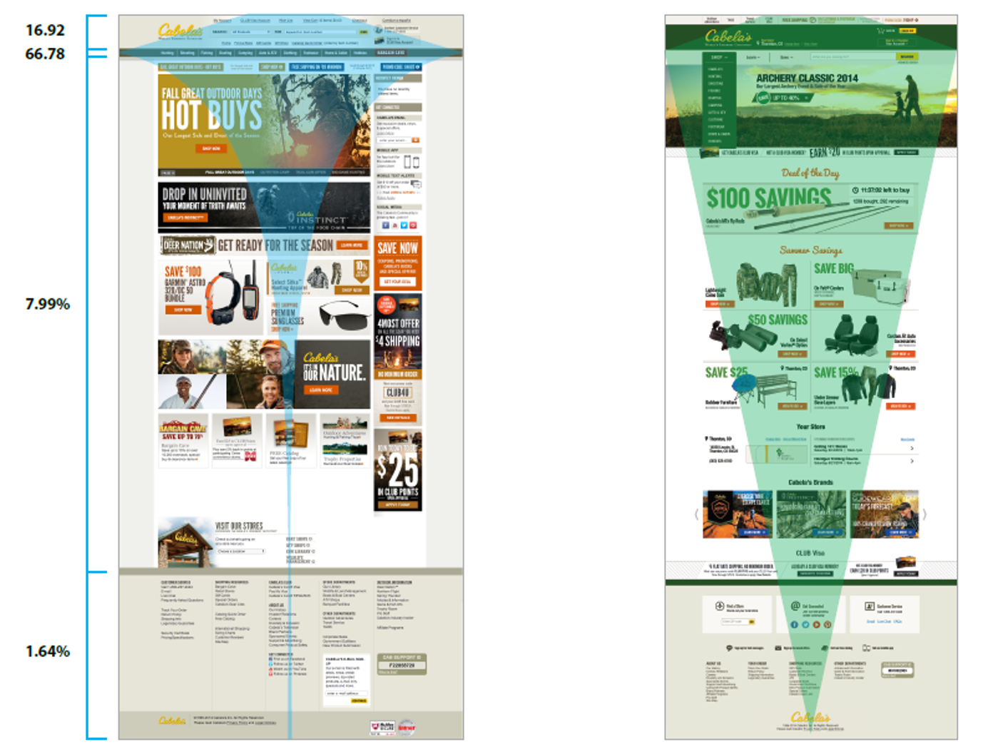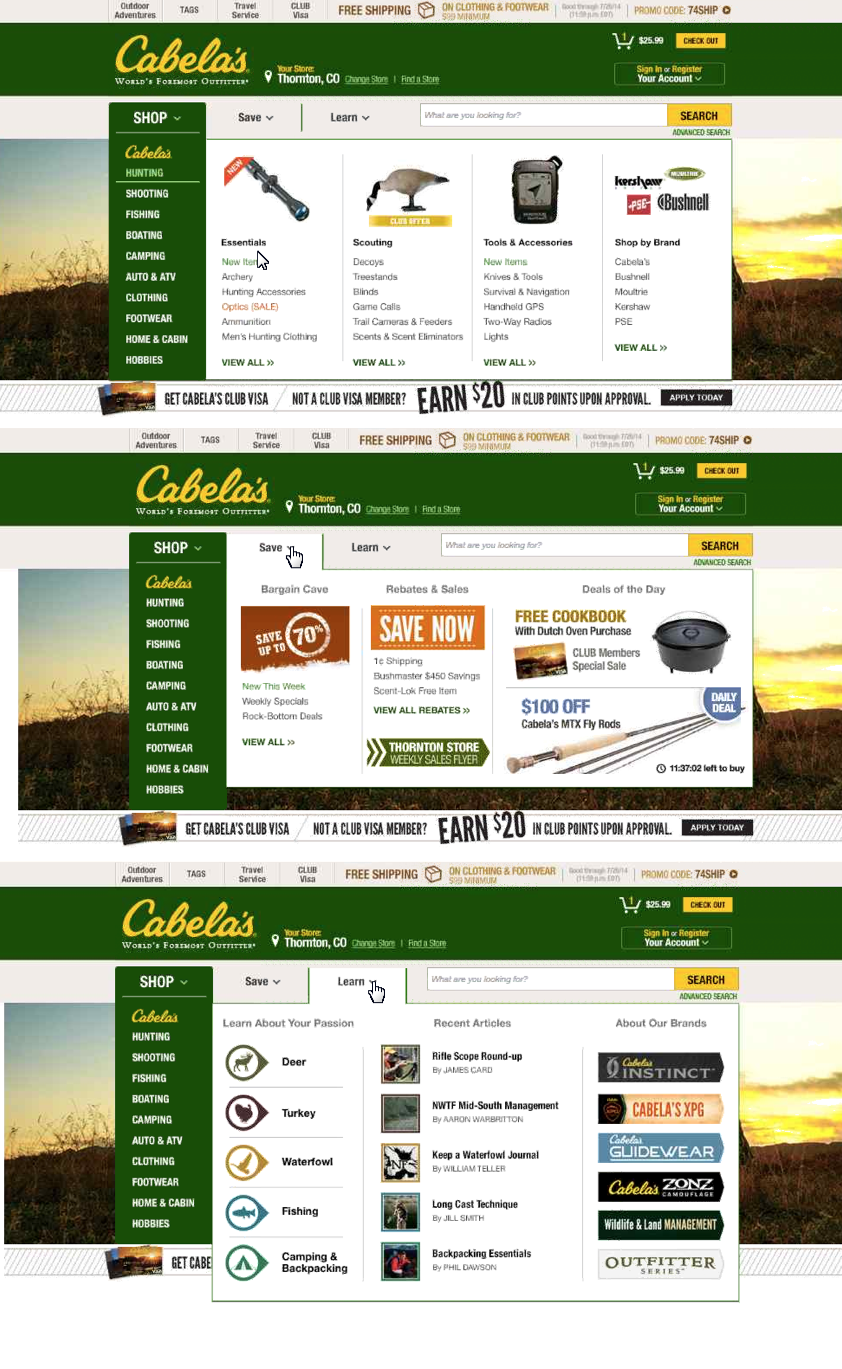 Leveraging our research, I led the development of a new homepage design that eliminated rigid bounding containers and embraced overlapping elements to reflect Cabela’s premium brand positioning. Lifestyle photography and contextual navigation links were integrated into banners to provide more direct access to user interests. A/B testing validated these choices, doubling clicks and sales compared to traditional designs.