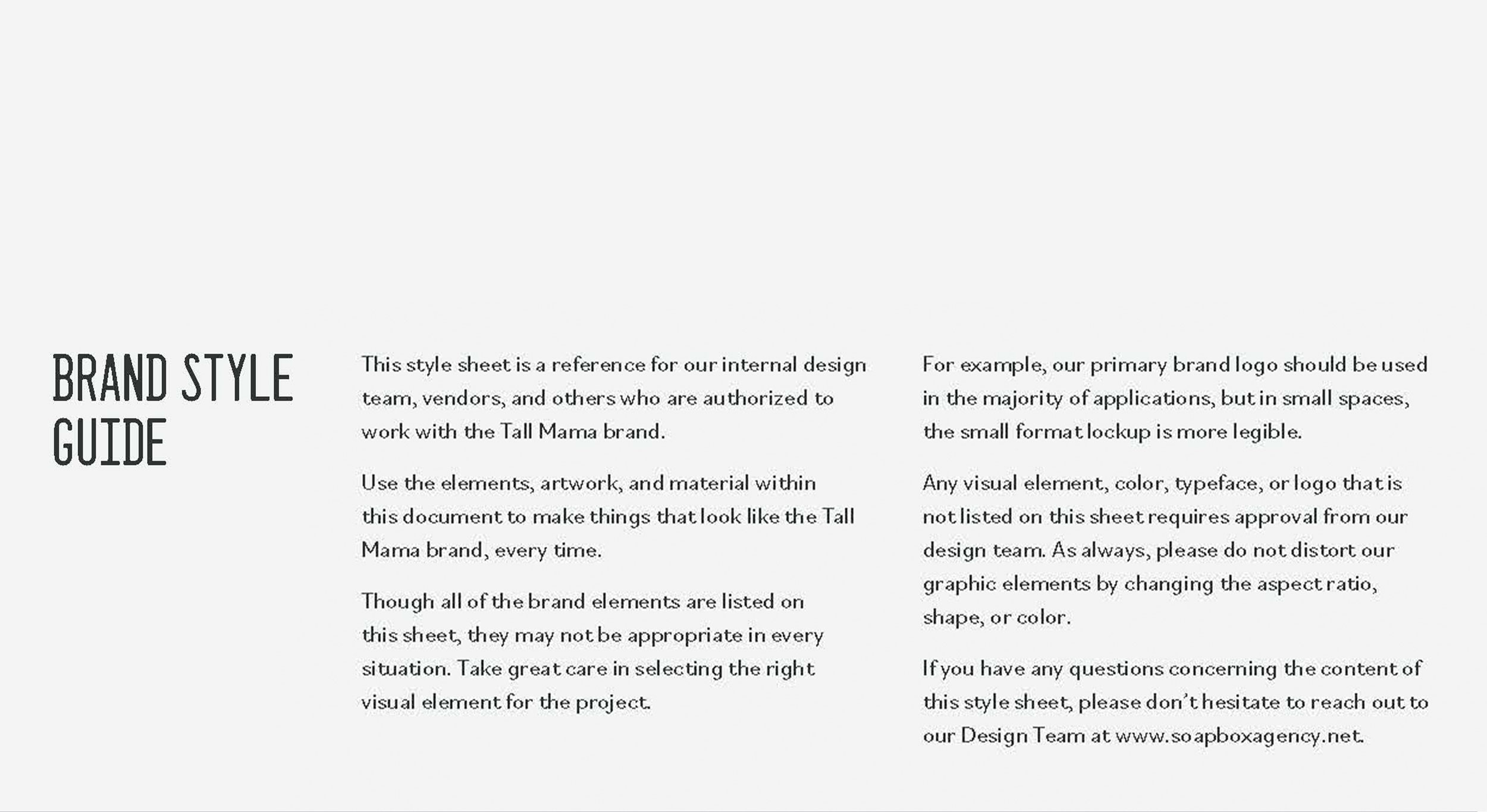 As the Executive Creative Director at Soapbox Agency, I led a team in developing a brand identity for Tall Mama Clothing Company, a startup focused on maternity clothing for tall women. This project required a cohesive logo and branding system with a tight two-week deadline. My role included initial client conversations, signing the contract, guiding creative development, and approving key deliverables, including the logo, style guide, and client pitch.